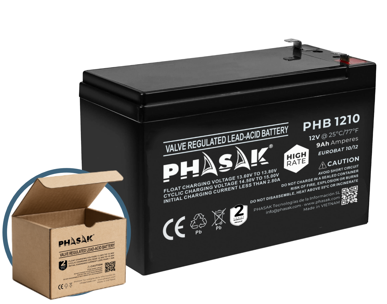 Batería sellada de plomo-ácido (VRLA) 12V · 9Ah de alta descarga para SAI/UPS y sistemas de seguridad. La PHB 1210 High Rate ofrece vida útil EUROBAT 10–12 años, baja autodescarga y mantenimiento cero para un respaldo energético estable y fiable.