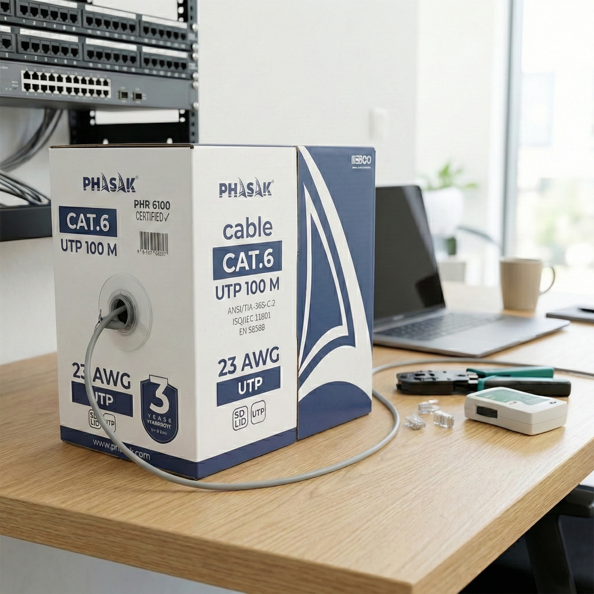 El PHR 6100 es un cable UTP de categoría 6 con conductor sólido CCA (AWG23), pensado para instalaciones permanentes entre patch panels y tomas de red. Su construcción sólida favorece la estabilidad eléctrica del enlace y un rendimiento fiable en entornos profesionales.