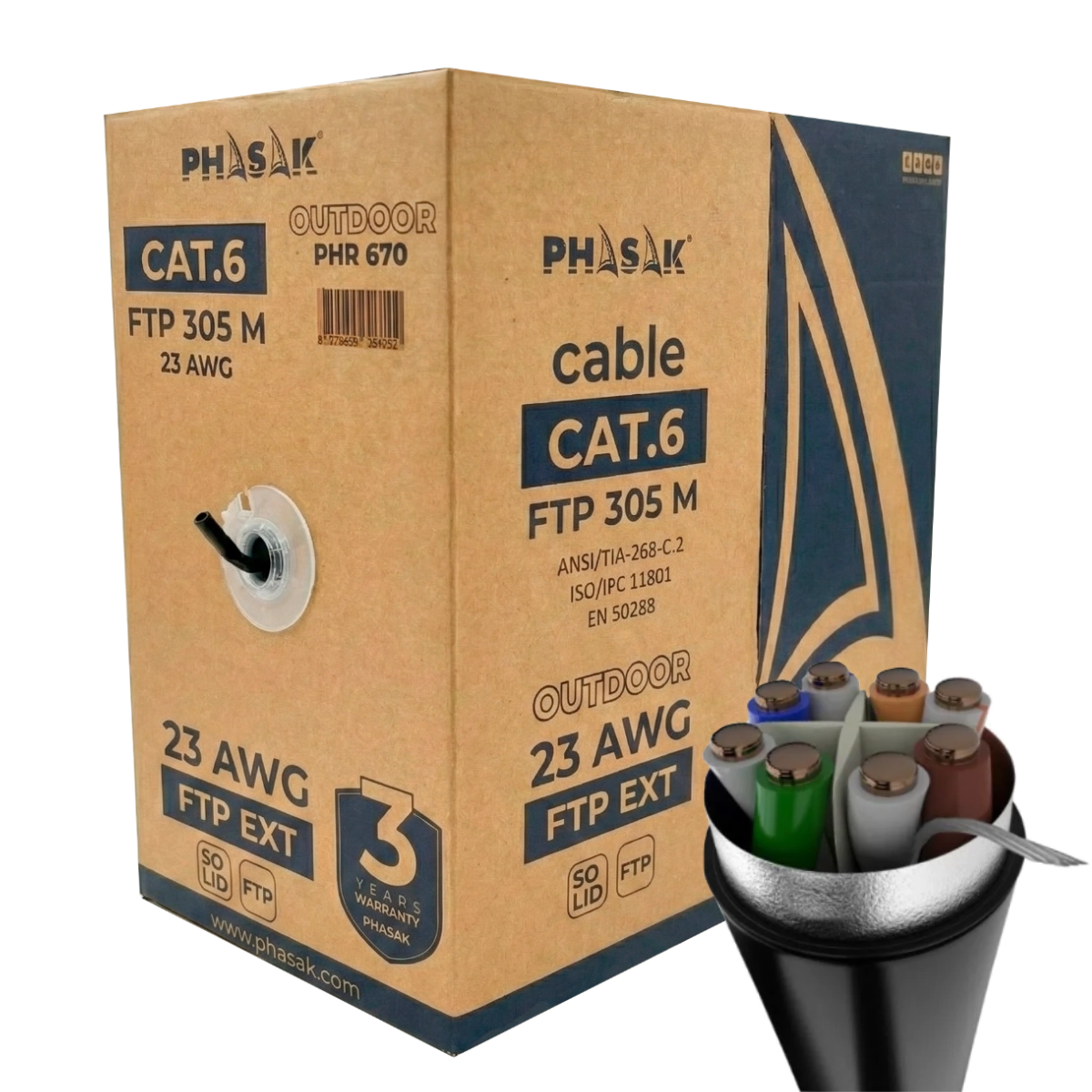 Bobina de cable de red exterior FTP Cat.6 con conductor AWG23 CCA (sólido), longitud 305 m. Pensado para tendidos en exterior, CCTV y enlaces de datos estables en infraestructuras profesionales. Modelo PHR 670.