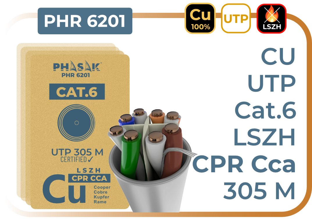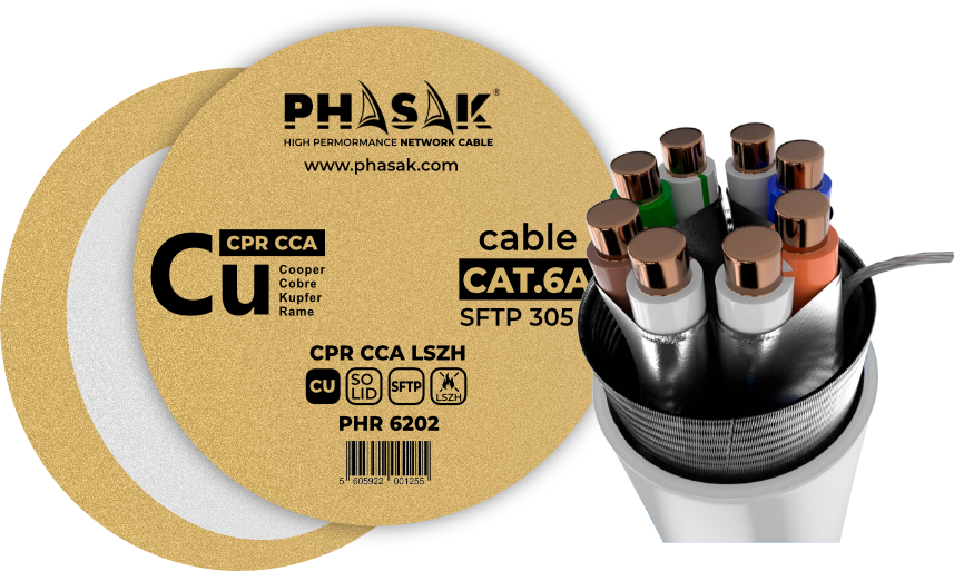 El PHR 6202 es un cable de par trenzado S/FTP Cat.6A fabricado en cobre 100% (sólido), con cubierta LSZH (Low Smoke Zero Halogen) y certificación CPR Cca. Diseñado para instalaciones interiores donde se exige alta seguridad frente al fuego y enlaces 10 Gigabit con excelente inmunidad al ruido.