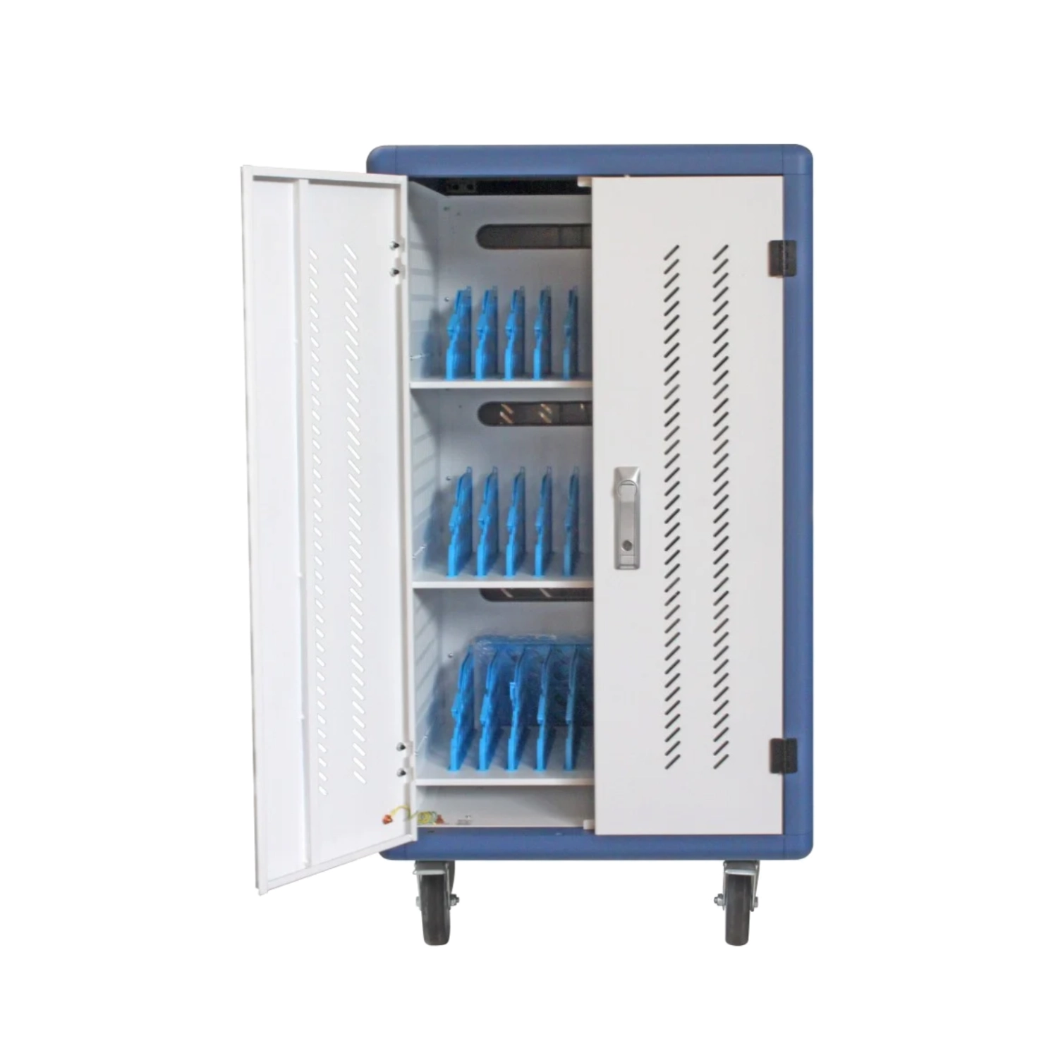 Estación de carga y almacenamiento PHASAK PHT 3530 para portátiles/tabletas (hasta 30 dispositivos). Integra 6 regletas Schuko (30 tomas), ventilación activa, gestión de cables, cerraduras 180°, disyuntor magneto-térmico e interruptor principal con luz. Estructura metálica robusta, ruedas de 5″ con freno doble y listo para usar (solo montar ruedas). 3500 W, 110/220 V–16 A.