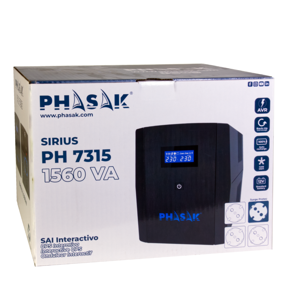 El PH 7315 es un SAI interactivo con AVR que estabiliza la tensión sin recurrir continuamente a la batería, ayudando a prolongar su vida útil. Ante un corte, suministra energía de forma inmediata para evitar reinicios y pérdida de datos en switches, routers, NAS, NVR/DVR y estaciones de trabajo.