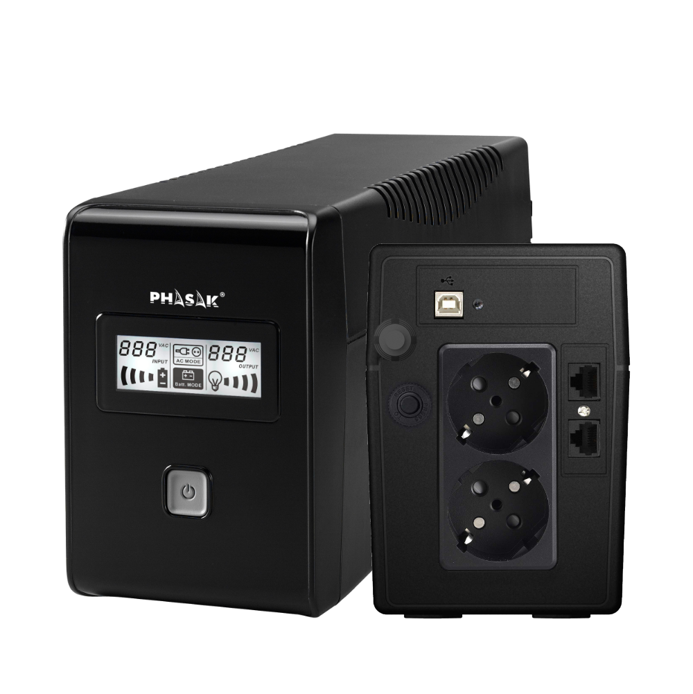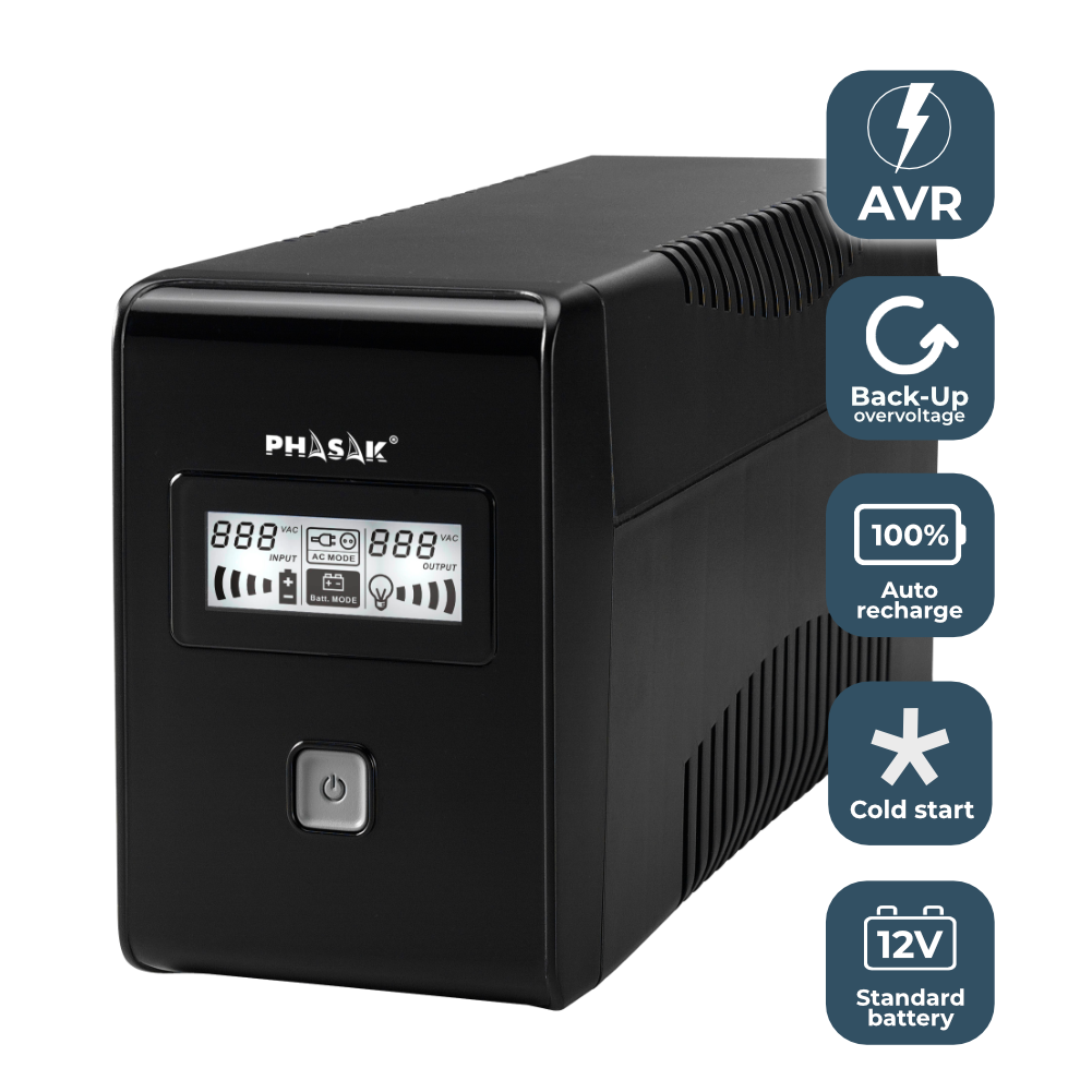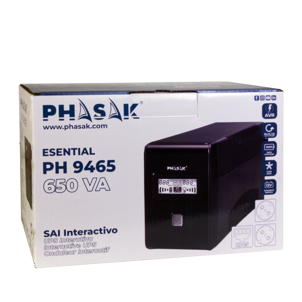 El PH 9485 es un SAI interactivo con AVR que estabiliza la tensión sin recurrir continuamente a la batería, ayudando a prolongar su vida útil. Ante un corte, suministra energía de forma inmediata para evitar reinicios, pérdida de datos y paradas inesperadas en ordenadores, NAS, routers/switches y pequeños equipos electrónicos.