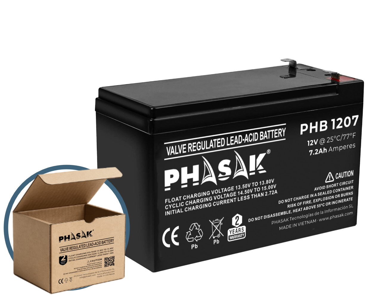 La PHASAK PHB 1207 es una batería sellada de plomo-ácido (VRLA) de 12V y 7.2Ah, diseñada para asegurar un suministro estable en sistemas de alimentación ininterrumpida, alarmas, CCTV e iluminación de emergencia. Su construcción sellada y libre de mantenimiento facilita la instalación y ofrece un rendimiento consistente en uso flotante.