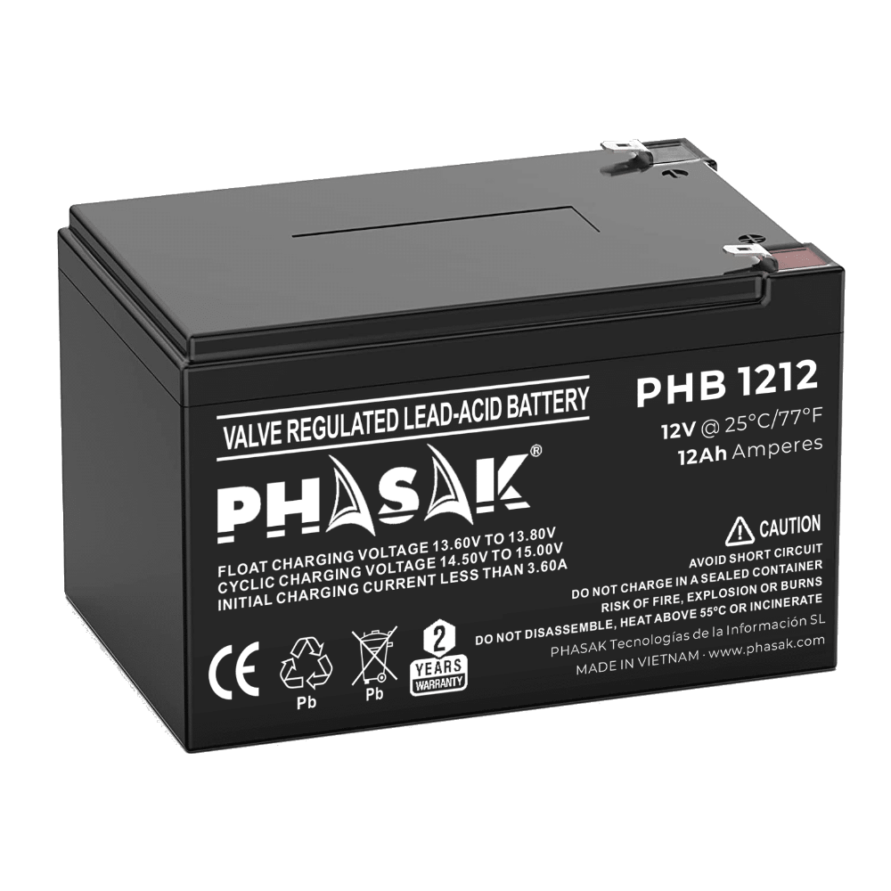 La PHASAK PHB 1212 es una batería sellada de plomo-ácido (VRLA) de 12V y 12Ah, diseñada para garantizar un suministro estable y seguro en sistemas de alimentación ininterrumpida, alarmas, CCTV e iluminación de emergencia. Su construcción sellada y libre de mantenimiento facilita la instalación y asegura un rendimiento consistente.