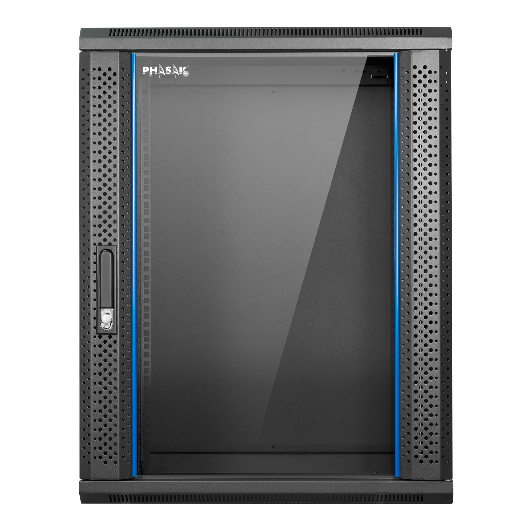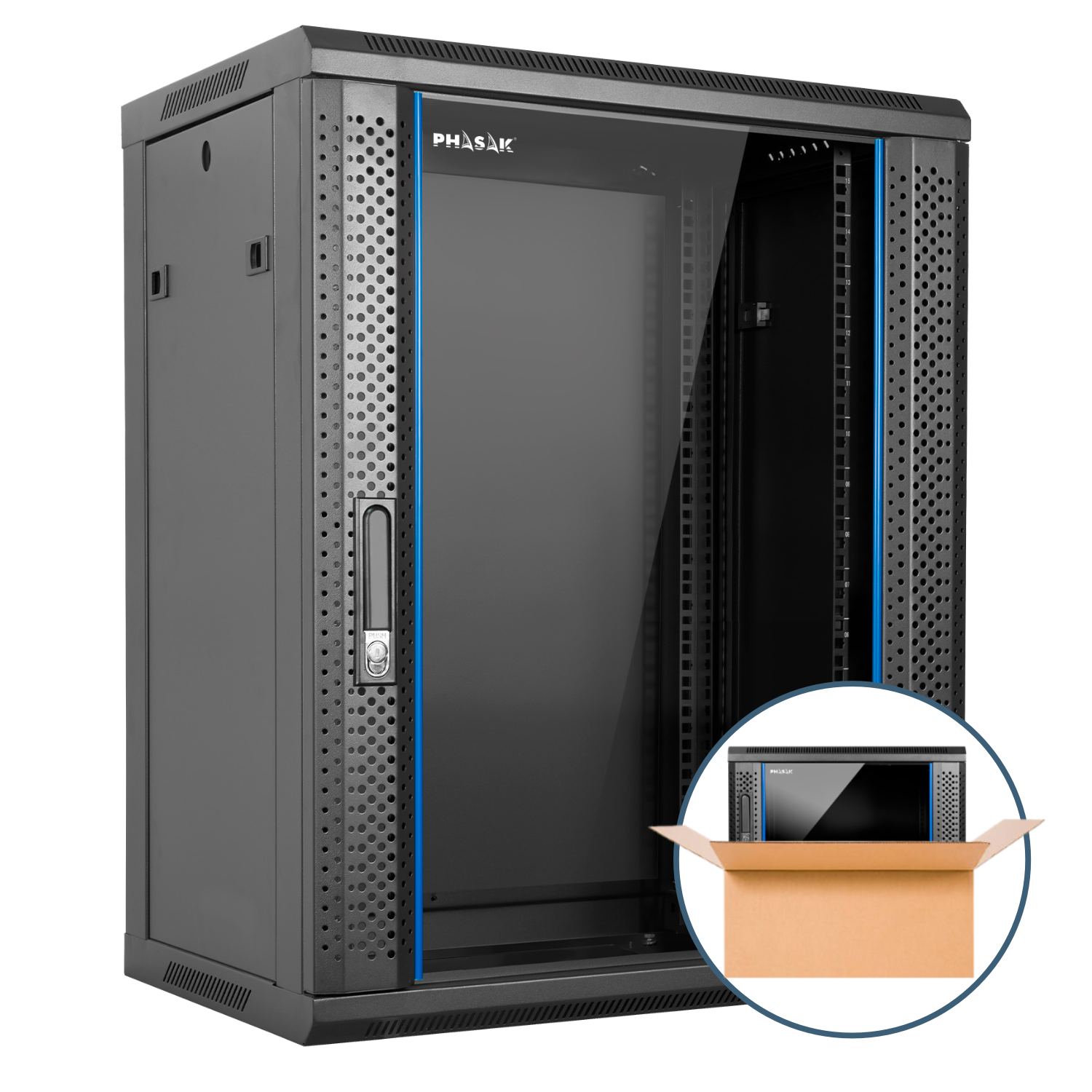 Rack mural PHASAK Pro 19″ premontado con puerta de vidrio templado, ventilación mejorada y cerradura de seguridad. Incluye bandejas y regleta 19″ para instalación profesional de red o videovigilancia.