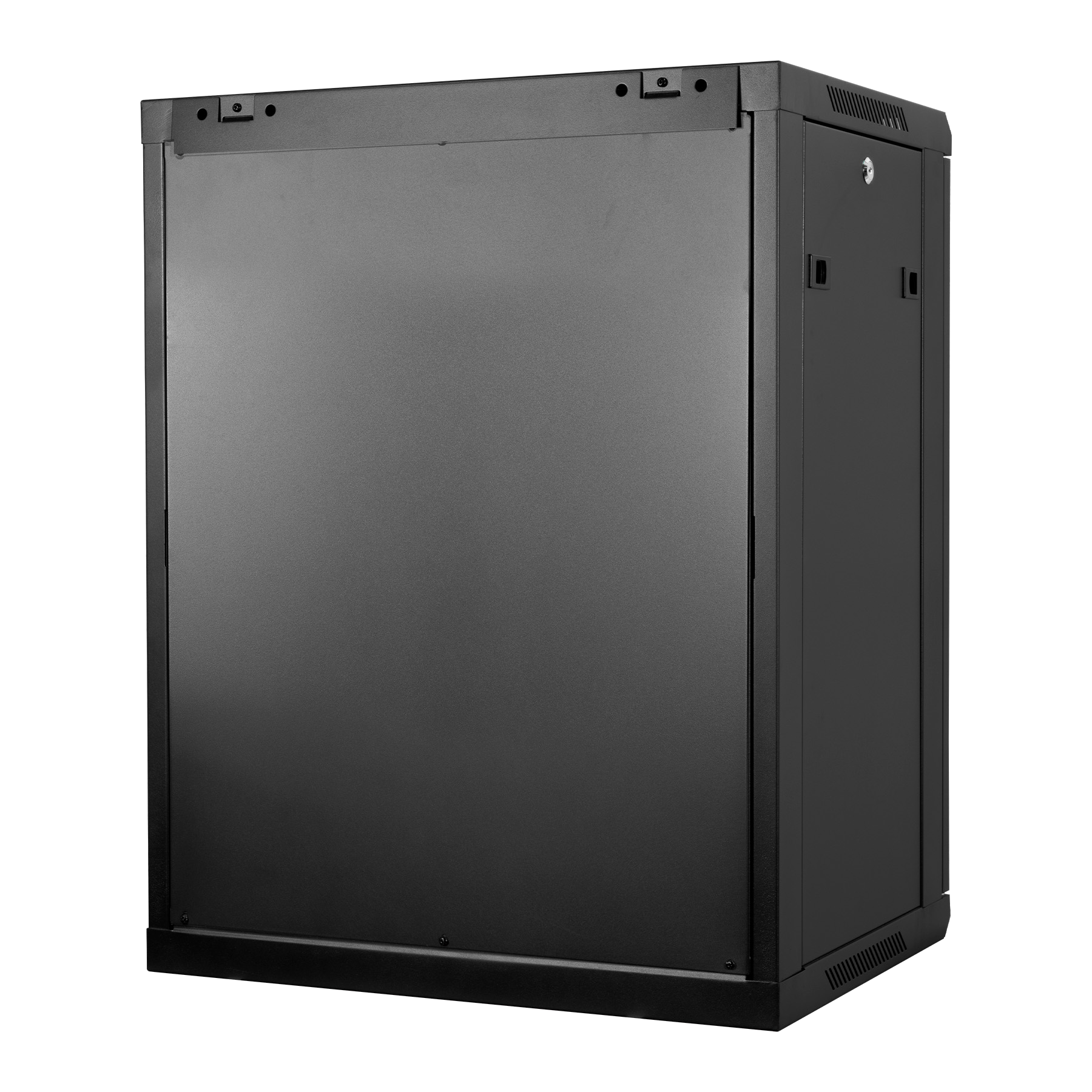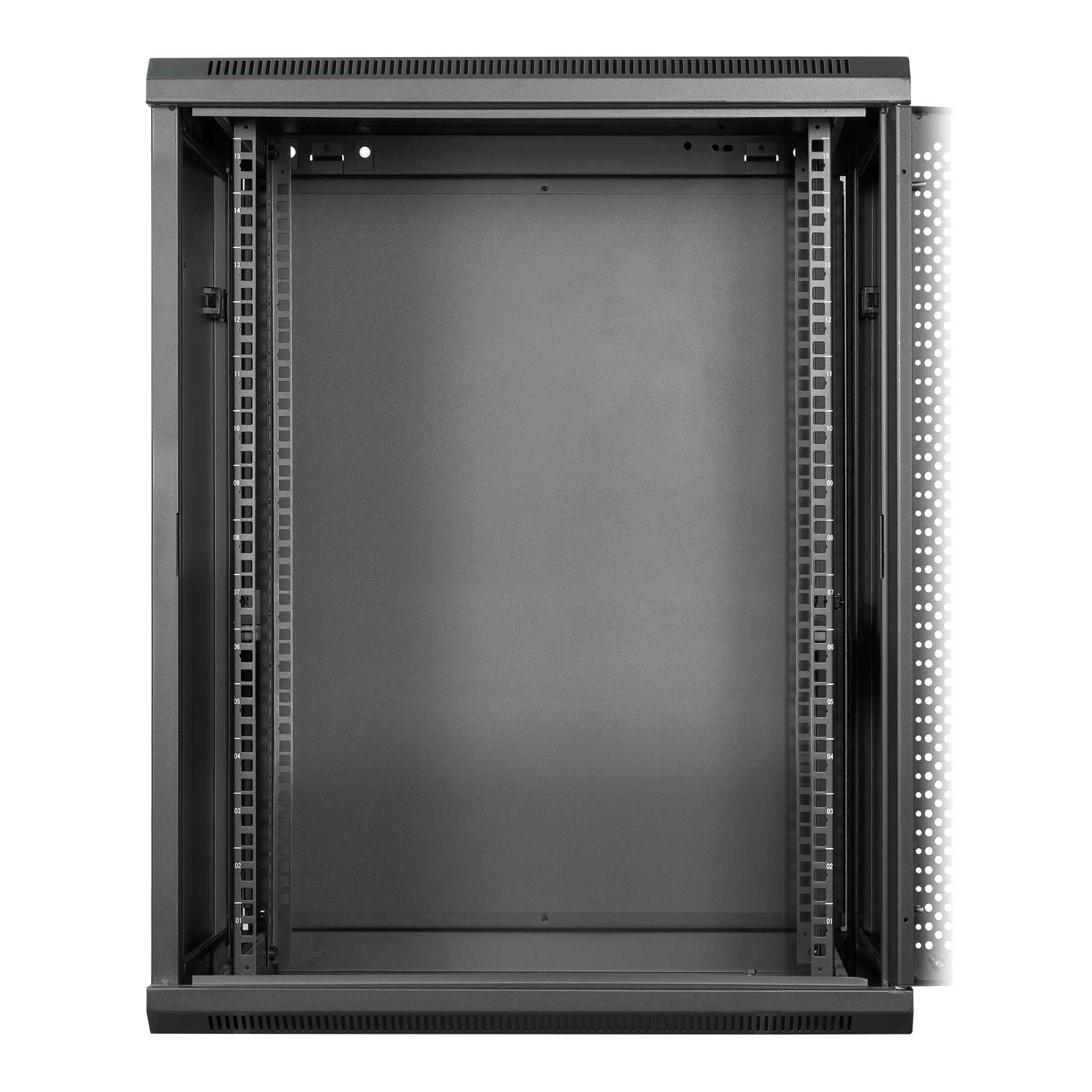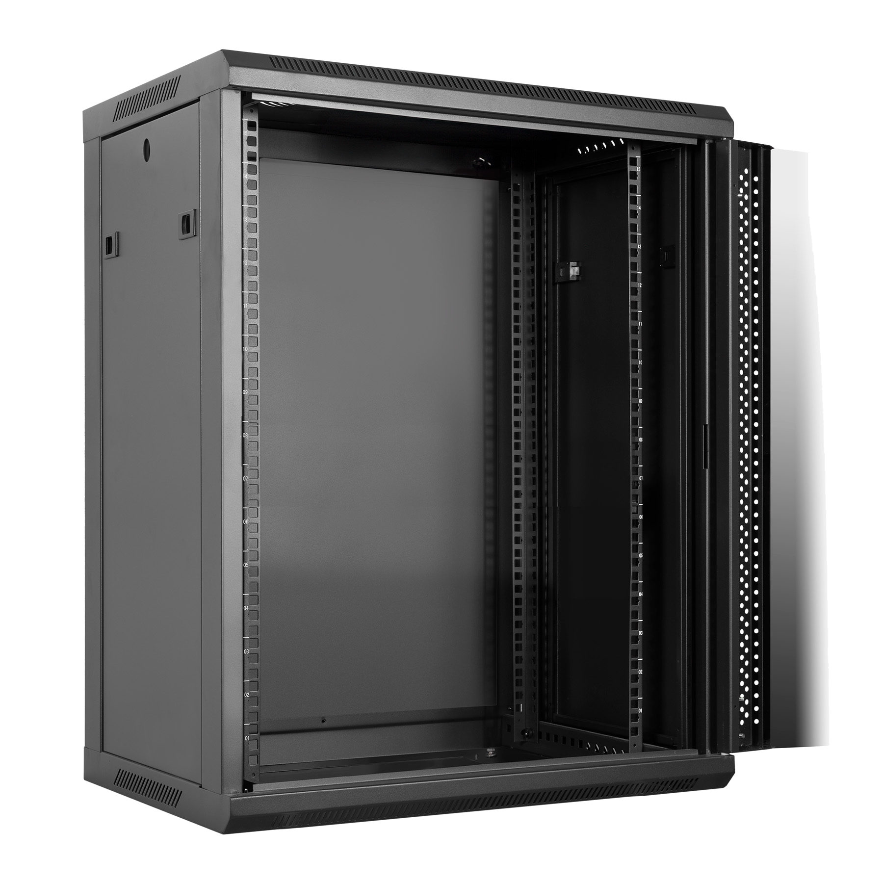 La puerta frontal de vidrio templado de 4 mm con marco metálico microperforado mejora la ventilación y protege el acceso no autorizado. Los paneles laterales “One Click” facilitan el mantenimiento, mientras que el diseño mural optimiza el espacio vertical en oficinas o salas técnicas.