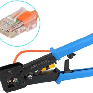 Crimpadora PHASAK TD 016 FastCrimp para RJ11/RJ12/RJ45, con topes de presión, mecanismo de trinquete y funciones integradas de corte y pelado. Construcción robusta para uso profesional y acabados limpios y precisos.