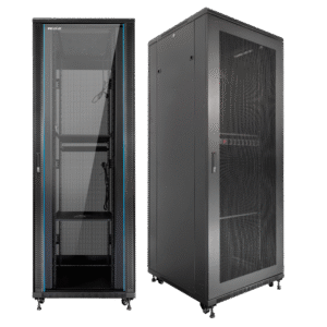 Armario Rack PHASAK Pro 19″ desmontado, con puerta de vidrio templado, ventilación y cerradura de seguridad. Incluye 2 bandejas, regleta eléctrica 19″ y ruedas.